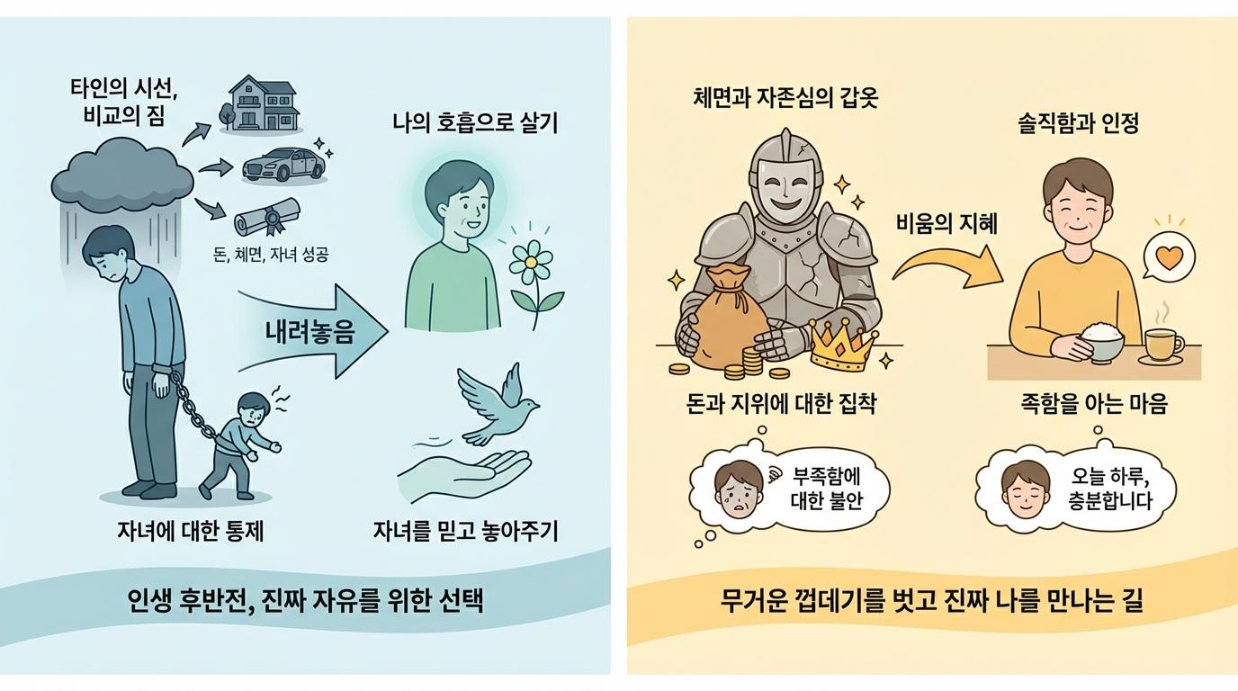 제3자의 시선에서 보면, 중년 이후의 삶을 가장 힘들게 하는 것은 부족함이 아닙니다. 오히려 이미 손에 쥔 것을 놓지 못하는 마음, 그리고 타인의 시선에 자신을 맞추려는 태도에 있습니다. 돈, 체면, 자녀의 성공... 이것들을 붙잡을수록 우리는 역설적으로 더 외로워집니다.