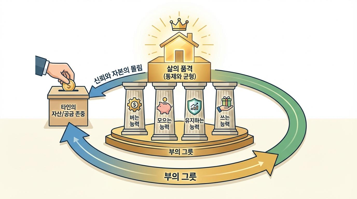 지속 가능한 부를 이루기 위해서는 돈을 버는 능력, 모으는 능력, 유지하는 능력, 쓰는 능력을 고루 갖추어야 합니다. 돈을 많이 버는 재능이 있더라도 관리에 미숙하면 모래성처럼 허물어지며, 모으는 데만 치중하면 부의 확장을 기대하기 어렵습니다. 특히 물가 상승률을 방어하며 자산의 가치를 지켜내는 유지의 능력은 끊임없는 공부와 통찰력을 요구합니다. 세상의 흐름을 읽고 변화에 기민하게 반응하는 태도는 자산을 성벽처럼 견고하게 지탱해 줍니다.