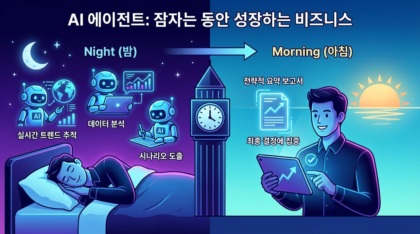 어둠이 깔린 밤, 기업의 최고 의사결정권자가 편안한 휴식을 취하는 동안에도 AI 마케팅 에이전트는 멈추지 않고 움직입니다. 전 세계의 소셜 미디어 트렌드를 실시간으로 추적하고, 고객들의 반응을 정밀하게 데이터화하며, 내일의 시장에서 승기를 잡기 위한 최적의 시나리오를 도출해냅니다. 아침 햇살과 함께 전달되는 것은 단순한 데이터의 나열이 아닙니다. AI 에이전트는 전략적 판단의 근거가 담긴 정교한 요약 보고서를 제공합니다. 이제 CEO는 복잡한 통계 수치를 일일이 읽고 해석하는 대신, 인공지능이 제안한 여러 갈래의 길 중에서 가장 가치 있는 방향을 선택하는 최종 결정권자로서의 핵심 직무에 집중할 수 있습니다.