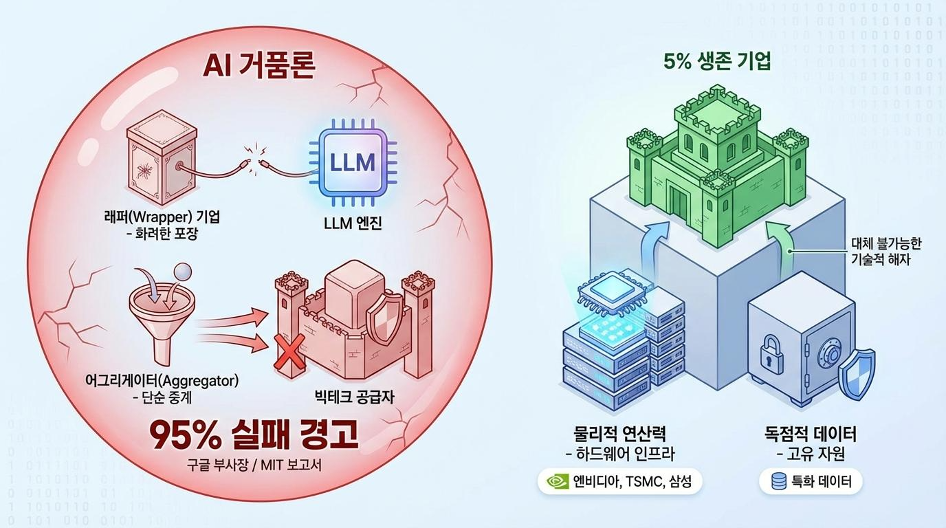 지금 우리가 주목해야 할 것은 화려한 앱의 디자인이 아니라, 그 서비스가 대체 불가능한 기술적 해자를 가졌는지, 아니면 언제든 대체될 수 있는 얇은 포장지에 불과한지 여부입니다. 기술의 병목 지점을 장악하거나 누구도 가질 수 없는 데이터를 소유하지 못한 기업들에게 남은 시간은 그리 길지 않을지도 모릅니다.
