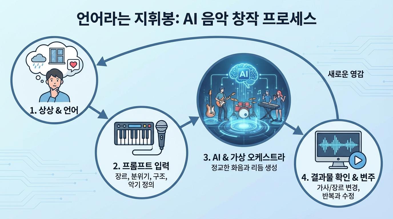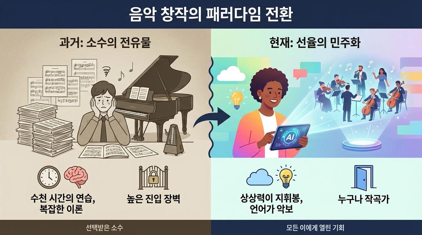불과 몇 년 전까지만 해도 음악은 선택받은 소수의 전유물이었습니다. 화성학의 복잡한 규칙을 익히고, 수천 시간을 악기 연습에 쏟아부어야만 비로소 세상에 자신의 선율을 내놓을 수 있었습니다. 하지만 이제 세상은 인공지능의 손을 빌려 누구나 작곡가가 될 수 있는 선율의 민주화 시대를 맞이하고 있습니다. 악보를 읽지 못해도, 악기를 다루지 못해도 상관없습니다. 오직 당신의 머릿속에 머물던 막연한 느낌을 정교한 언어로 번역할 수만 있다면, AI는 그 즉시 수천 명의 오케스트라와 보컬을 소집하여 당신만을 위한 무대를 만들어 드립니다.
