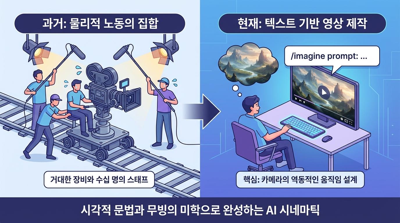 과거의 영상 제작이 거대한 카메라와 레일, 그리고 수십 명의 스태프가 움직이는 물리적인 노동의 집합이었다면, 이제는 단 몇 줄의 묘사로 웅장한 시네마틱 뷰를 구현하는 텍스트 기반 영상 제작의 시대가 도래했습니다. 하지만 AI 영상 생성 도구를 처음 접하는 이들은 종종 당혹감에 빠지곤 합니다. 머릿속에는 장엄한 풍경이 그려지는데, 정작 결과물은 박제된 사진처럼 정지해 있거나 의도치 않은 방향으로 흘러가기 때문입니다. 좋은 영상 프롬프트의 핵심은 대상의 묘사가 아니라 카메라의 역동적인 움직임을 설계하는 것에 있습니다.