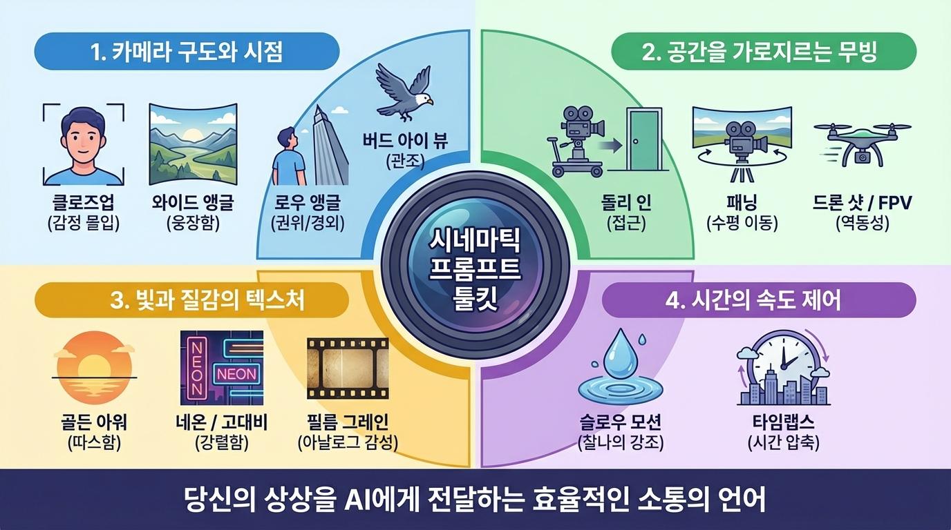 특히 시점의 높낮이를 조절하는 것만으로도 영상의 심리적 무게감은 완전히 달라집니다. 대상을 아래에서 위로 올려다보는 '로우 앵글(Low Angle)'은 경외감과 권위를 부여하고, 반대로 위에서 아래를 조망하는 '버드 아이 뷰(Bird's Eye View)'는 초월적인 관조의 시선을 제공합니다. 렌즈의 위치와 각도를 명시하는 것은 정적인 이미지를 역동적인 영상으로 탈바꿈시키는 첫 번째 비밀입니다.