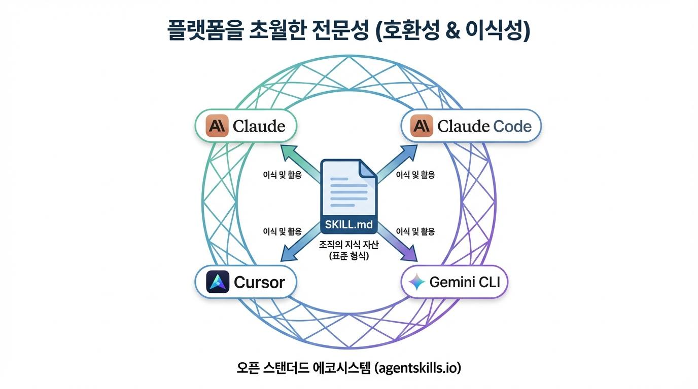 2025년 12월, Anthropic은 스킬 시스템을 오픈 스탠더드(agentskills.io)로 공개하며 한층 더 나아간 선언을 했습니다. 이는 단순한 기능 추가가 아니라 업계 표준을 선점하려는 전략적 행보입니다. 동일한 SKILL.md 형식으로 작성된 스킬은 클로드뿐 아니라 Claude Code, 그리고 이 표준을 채택한 다른 AI 플랫폼에서도 동일하게 동작합니다.