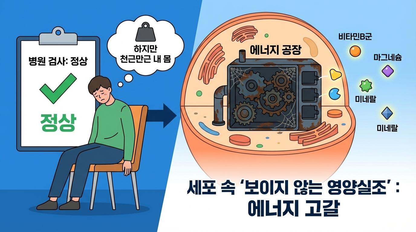 이때 우리가 느끼는 피로는 단순한 휴식 부족이 아닙니다. 세포가 제 기능을 하기 위해 필수적인 원료가 공급되지 않아 발생하는 화학적 기근 상태, 즉 ‘보이지 않는 영양실조’가 원인일 가능성이 매우 높습니다. 겉으로는 아무 문제 없어 보이는 당신의 몸이 사실은 속으로 굶주리고 있다는 사실을 직시해야 합니다.