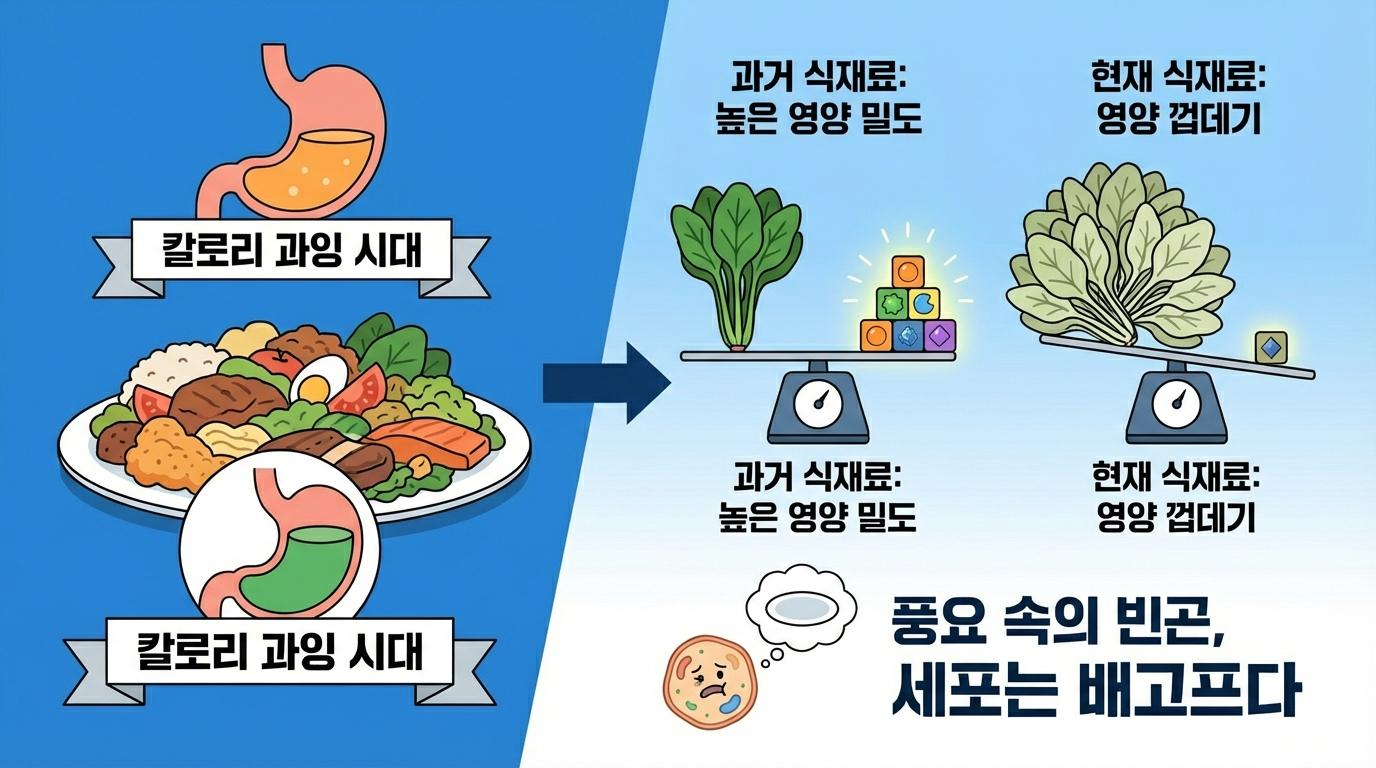 우리는 칼로리가 넘쳐나는 풍요의 시대를 살고 있지만, 역설적으로 우리 몸에 꼭 필요한 미량 영양소는 턱없이 부족한 ‘배부른 영양실조’ 상태에 놓여 있습니다. 배는 부르지만 세포는 굶주리고 있기에, 몸은 계속해서 무언가를 먹으라고 신호를 보내고, 먹어도 에너지가 나지 않으니 다시 눕게 되는 악순환이 반복되는 것입니다. 이것이 바로 아무리 잘 먹어도 피곤한 이유입니다.