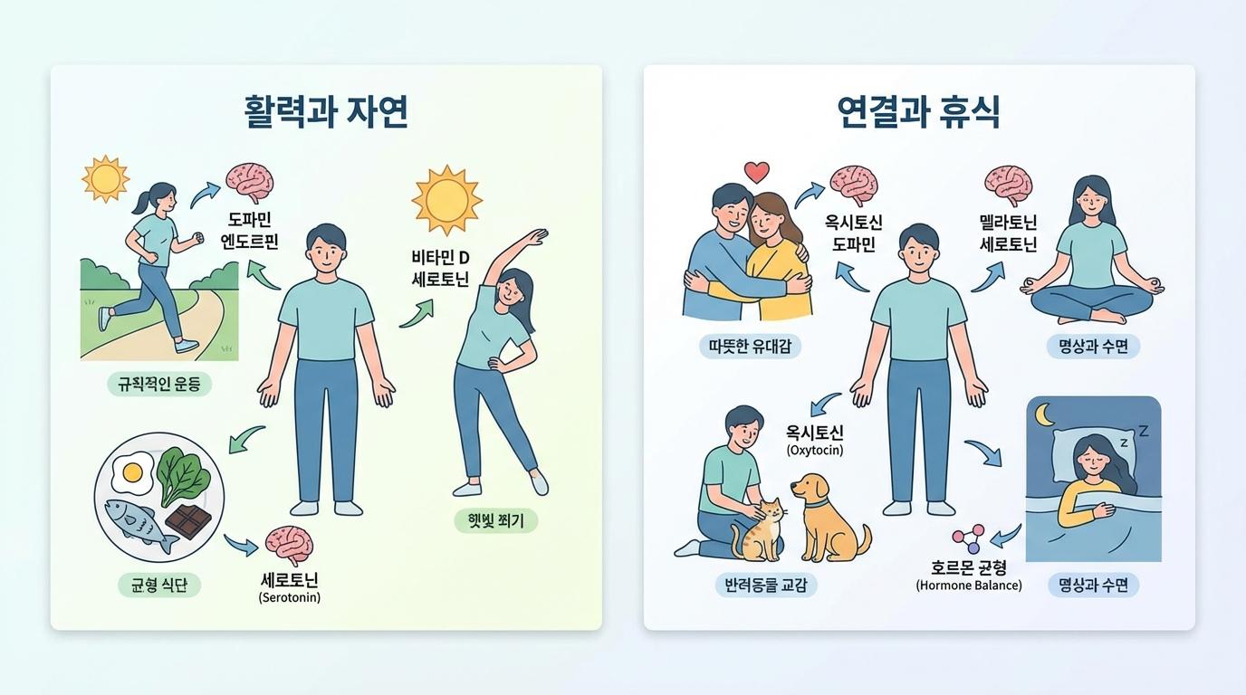 우리의 기분과 활력을 결정짓는 네 가지 주요 호르몬, 즉 도파민, 세로토닌, 엔도르핀, 옥시토신은 각각 고유한 역할을 수행하며 우리의 심신을 안정시키고 즐거움을 느끼게 합니다. 이 호르몬들이 균형 있게 분비될 때 우리는 비로소 진정한 평온과 행복을 경험하게 됩니다. 오늘은 이 행복 호르몬들을 활성화하여 일상을 풍요롭게 만드는 구체적인 방법들을 살펴보겠습니다.