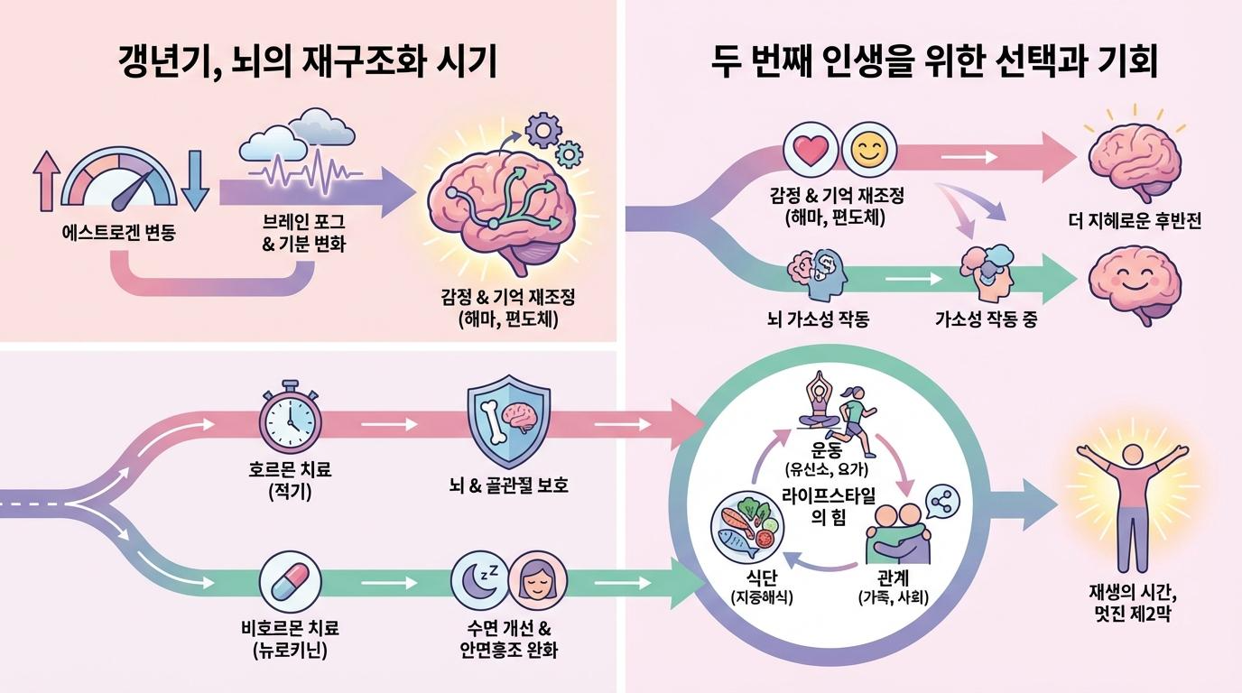 인생의 절반쯤 왔을 때 찾아오는 갱년기를 우리는 흔히 ‘저무는 시기’라고 오해하곤 합니다. 하지만 최신 신경과학과 2025-2026년 글로벌 가이드라인이 밝혀낸 진실은 전혀 다릅니다. 갱년기는 단순한 생식 기능의 종료가 아니라, 뇌가 새로운 생애 주기에 맞춰 고도화된 재구조화를 단행하는 결정적 전환기입니다.