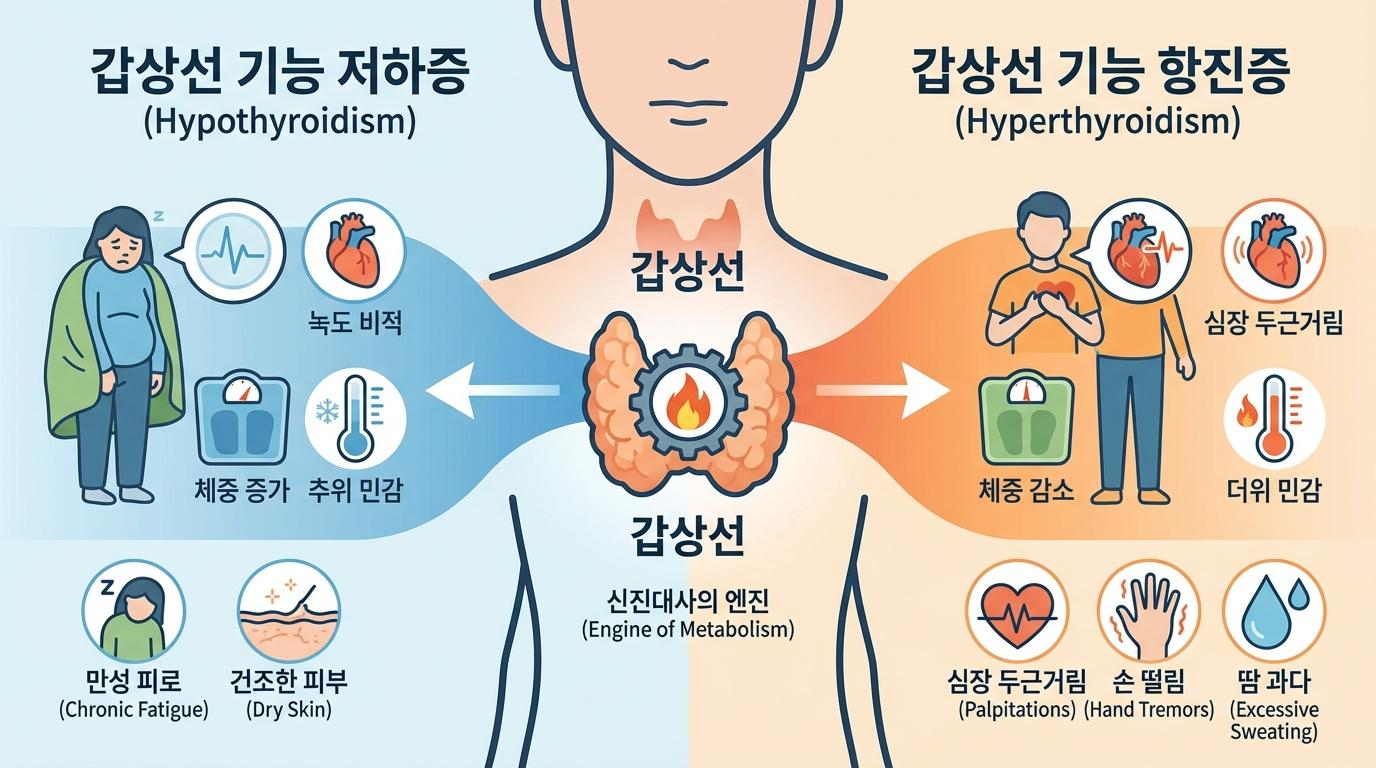 갑상선 호르몬의 불균형은 크게 두 가지 형태로 나타납니다. 첫째는 호르몬이 부족해지는 '갑상선 기능 저하증'입니다. 특별히 많이 먹지 않는데도 몸이 붓고 체중이 늘어난다면 이를 의심해볼 수 있습니다. 호르몬이 부족해지면 몸의 대사 속도가 느려져 마치 엔진이 꺼져가는 것처럼 느껴집니다. 이로 인해 한없이 몸이 무겁고 기력이 없으며, 남들보다 추위를 유난히 심하게 타게 됩니다. 피부가 건조해지고 변비가 생기거나 목소리가 쉬는 증상이 나타나기도 하며, 심한 경우 기억력 감퇴나 우울감을 동반하여 단순히 노인성 질환으로 오인되기도 합니다. 특히 여성의 경우 월경량이 많아지거나 주기가 불규칙해지는 변화가 나타날 수 있습니다.