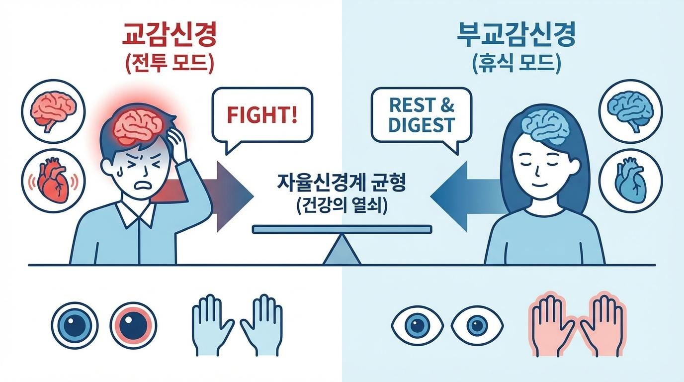 우리 몸에는 내 의지와 상관없이 생명을 유지하기 위해 24시간 깨어있는 자동 제어 시스템, 바로 '자율신경계'가 존재합니다. 이 시스템은 마치 자동차의 엑셀과 브레이크처럼 서로 정반대의 역할을 하는 두 가지 신경으로 구성되어 있습니다. 하나는 위기 상황에서 몸을 전투 태세로 전환시키는 '교감신경'이고, 다른 하나는 휴식과 회복을 담당하는 '부교감신경'입니다.