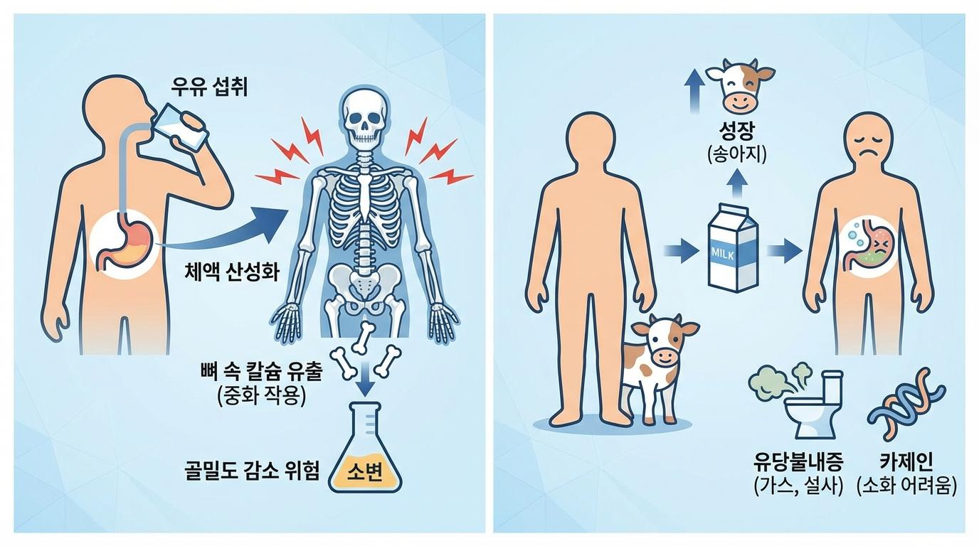 우유는 동물성 단백질이 매우 풍부한 식품입니다. 우리가 동물성 단백질을 섭취하면 대사 과정에서 산성 물질이 생성되어 체액이 산성으로 기울게 됩니다. 우리 몸은 생존을 위해 혈액의 pH(산성도)를 약알칼리성으로 일정하게 유지하려는 강력한 항상성을 가지고 있습니다. 이때 산성화된 몸을 중화시키기 위해 가장 손쉽게 끌어다 쓰는 알칼리성 미네랄이 바로 뼈 속에 저장된 '칼슘'입니다.