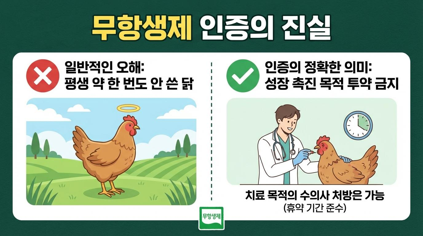 가장 먼저 바로잡아야 할 오해는 바로 ‘무항생제’라는 단어의 정의입니다. 대부분의 소비자는 이를 ‘태어나서 죽을 때까지 항생제를 단 한 번도 맞지 않은 닭’이라고 해석합니다. 하지만 축산법상 무항생제 인증의 정확한 의미는 조금 다릅니다. 이는 사료에 항생제를 섞어 먹이는 행위, 즉 인위적인 성장 촉진을 목적으로 한 투약을 금지한다는 뜻입니다.