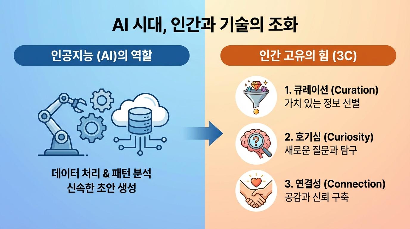 첫째, 큐레이션(Curation) 능력입니다. 쏟아지는 정보와 수많은 AI 서비스 중에서 무엇이 정말 중요하고 유용한지를 선별하는 통찰력입니다. 단순히 정보를 나열하는 것을 넘어, 이를 우리의 맥락에 맞게 재구성하고 의미 있는 메시지로 가공하여 타인에게 전달하는 능력은 오직 인간만이 할 수 있는 역할입니다. 정보의 바다에서 길을 잃지 않도록 안내하는 편집자이자 안내자의 역할이 더욱 중요해지고 있습니다.