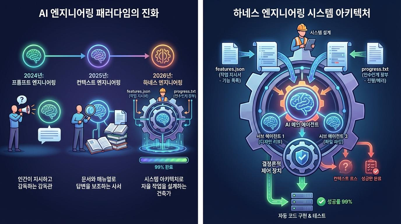 금요일 저녁, 거대한 소프트웨어 프로젝트를 인공지능에 맡기고 평소처럼 퇴근하는 상황을 상상해 보십시오. 그리고 월요일 아침, 사람의 개입 없이도 완벽하게 작동하는 5만 줄의 코드가 서버에 구현되어 있다면 어떨까요? 이러한 장면은 더 이상 공상 과학 영화 속의 이야기가 아닙니다. 2026년 현재, 글로벌 테크 기업들의 현장에서 실제로 벌어지고 있는 일입니다. 인공지능이 단순히 질문에 답하는 수준을 넘어, 스스로 복잡한 과업을 완수하게 만드는 새로운 패러다임, 바로 하네스 엔지니어링(Harness Engineering)의 시대가 도래했습니다.