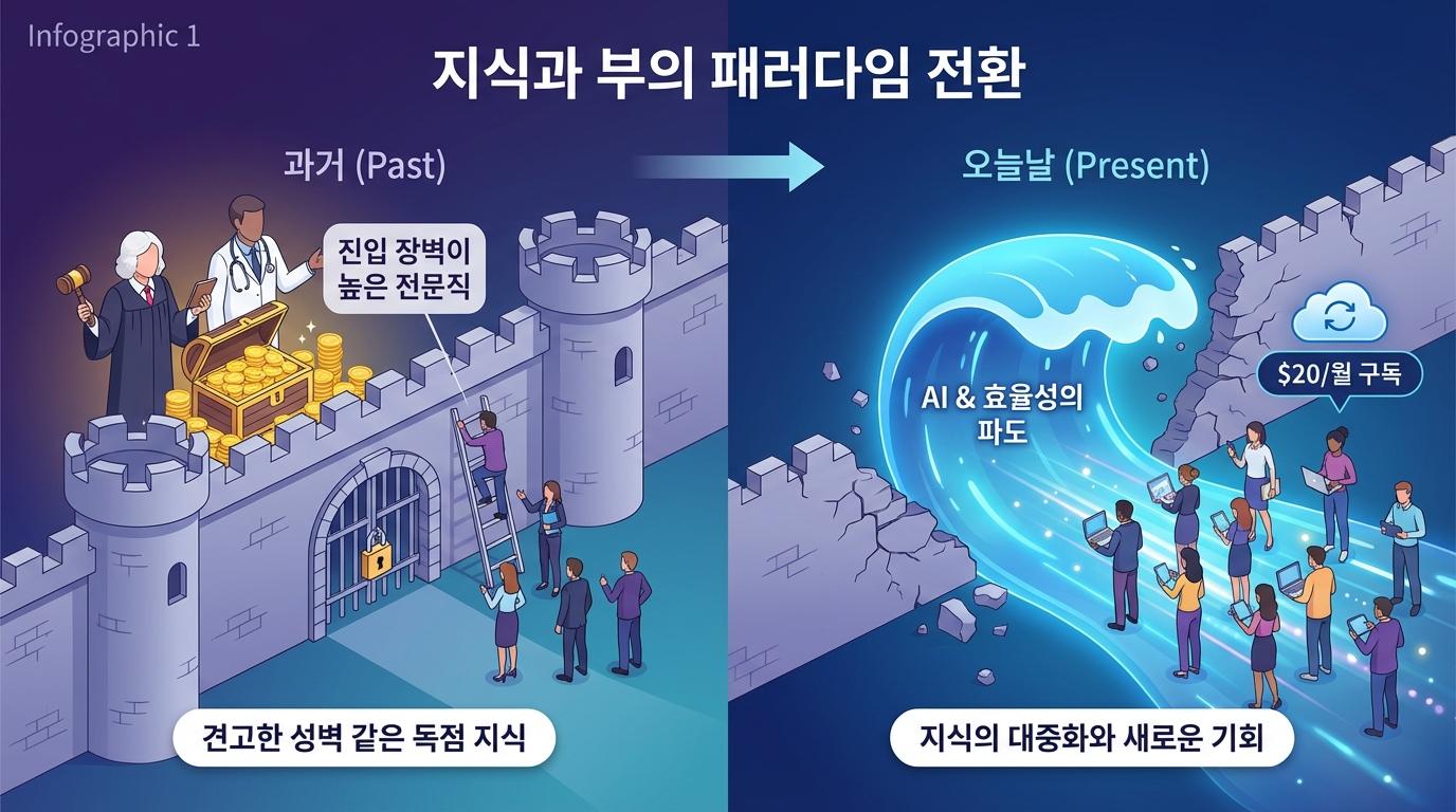 과거에는 특정 지식과 자격증을 독점한 전문가들만이 부를 축적할 수 있었습니다. 변호사나 의사처럼 진입 장벽이 높은 전문직은 선망의 대상이었고, 그들만이 가진 방대한 지식은 강력한 성벽과 같았습니다. 그러나 오늘날 우리는 전혀 다른 현실을 마주하고 있습니다. 한때 수천만 원을 지불해야 접근할 수 있었던 고급 지식이 이제는 누구나 월 20달러 정도의 구독료만으로 실시간 활용 가능한 공공재가 되고 있습니다.
