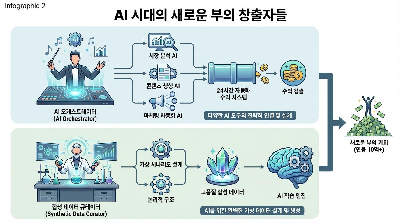 이러한 혼돈의 시대에 가장 먼저 두각을 나타내는 새로운 직업은 바로 ‘AI 오케스트레이터’입니다. 이들은 단순히 AI에게 질문을 던지고 답변을 얻는 사용자가 아닙니다. 수십, 수백 개의 특화된 AI 도구들을 전략적으로 배치하고 서로 연결하여, 사람의 직접적인 개입 없이도 거대한 수익 모델이 스스로 작동하도록 만드는 자동화 시스템의 설계자입니다. 과거 연 매출 100억 원을 달성하기 위해 수십 명의 직원이 필요했다면, 오케스트레이터는 단 한 명의 직원도 없이 각 분야에서 가장 강력한 AI들을 디지털 직원으로 고용하여 압도적인 성과를 창출합니다.
