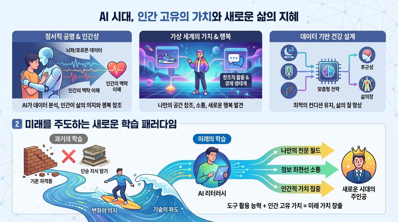 미래에 가장 소중한 가치는 단순한 논리적 정답이 아닌, 바로 정서적 공명이 될 것입니다. 단순히 위로를 건네는 것을 넘어, 우리의 뇌파 데이터와 호르몬 수치, 그리고 AI 비서가 수집한 일상 기록까지 분석하여 개인의 삶을 섬세하게 이해하고 재설계하는 새로운 시도가 부상하고 있습니다. 0과 1로 이루어진 코드는 인간의 눈물 속에 담긴 복잡한 맥락을 100% 이해할 수 없기 때문입니다. 데이터 분석은 AI가 할지라도, 그 결과를 바탕으로 삶의 의지를 만들어내고 진정한 행복을 찾아가는 과정은 결국 인간 고유의 몫입니다.