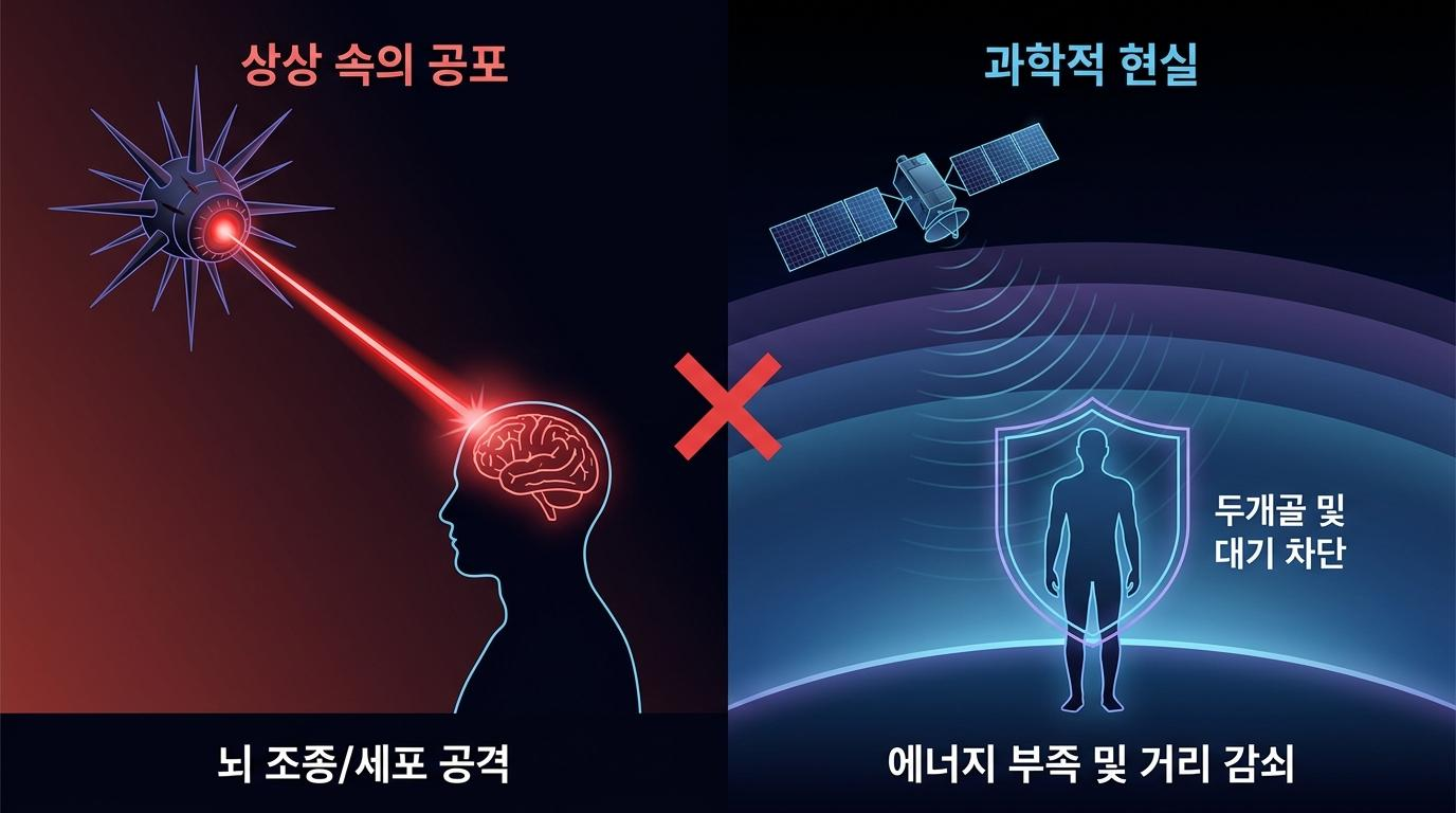 인체에 유의미한 손상을 입히려면 전자레인지 수준 이상의 고출력 에너지가 필요하거나, X선과 같은 고에너지 방사선이 필요합니다. 그러나 위성은 수백 킬로미터 상공에 떠 있으며, 전파는 거리의 제곱에 비례해서 급격하게 약해집니다. 지상의 인간에게 영향을 줄 만큼 강력한 에너지를 전달하려면 위성에 상상조차 할 수 없는 거대한 발전 설비를 탑재해야 하는데, 이는 현재 우주 기술로는 구현할 수 없는 영역입니다.