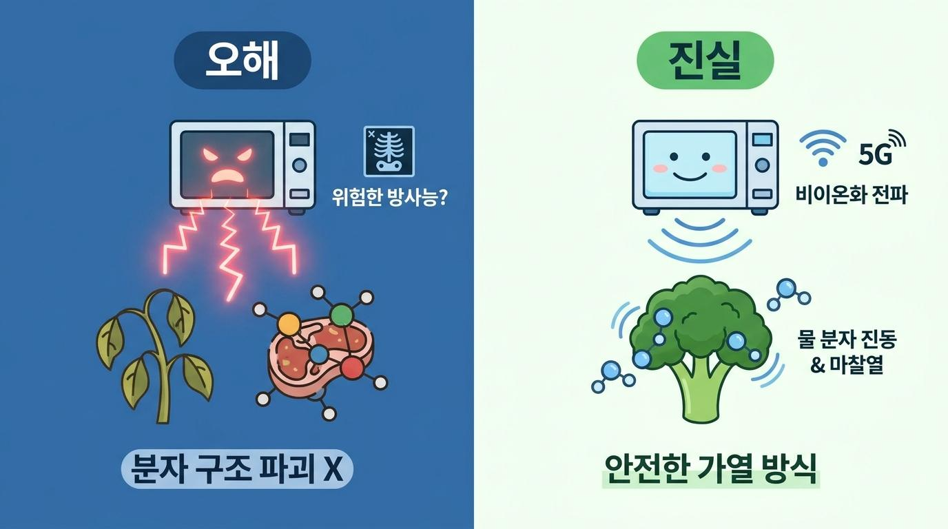 주방의 필수 가전인 전자레인지는 편리함의 상징인 동시에, 가장 많은 오해를 받는 기기이기도 합니다. "전자레인지로 데운 물로 식물을 키우면 죽는다"거나 "전자파가 음식의 분자 구조를 파괴해 암을 유발한다"는 식의 괴담은 지금도 인터넷을 떠돌고 있습니다. 이러한 공포의 핵심에는 전자파라는 단어가 주는 막연한 거부감이 자리 잡고 있습니다. 하지만 물리적으로나 생물학적으로 전자레인지의 작동 원리를 들여다보면, 우리가 알던 상식과는 전혀 다른 결론에 도달하게 됩니다.