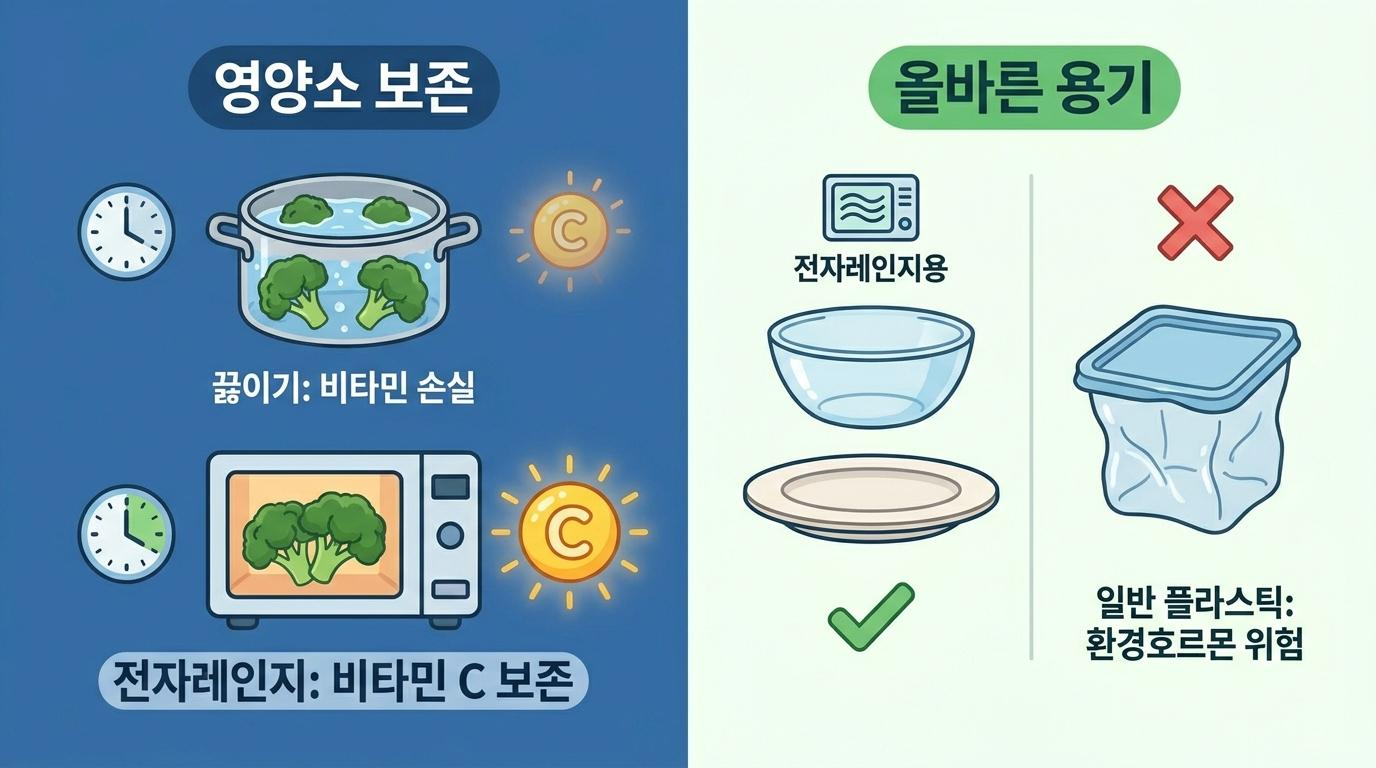 많은 분이 전자레인지로 음식을 익히면 영양소가 다 파괴된다고 믿지만, 과학적 데이터는 정반대의 결과를 보여줍니다. 영양소, 특히 비타민 C와 같은 수용성 비타민은 조리 시간이 길수록, 물을 많이 사용할수록, 온도가 높을수록 더 많이 파괴됩니다. 전자레인지는 다른 조리법에 비해 조리 시간이 매우 짧고 물을 거의 사용하지 않기 때문에, 오히려 채소의 비타민 보존율이 끓이거나 삶는 방식보다 훨씬 높습니다.