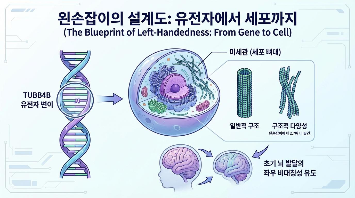 2024년, 과학계는 이 질문에 대한 중요한 단서를 찾아냈습니다. 바로 'TUBB4B'라는 유전자의 발견입니다. 우리 몸의 세포 내부에는 '미세관'이라는 뼈대가 있어 세포의 형태를 유지하고 물질을 운송합니다. TUBB4B 유전자는 이 미세관을 만드는 단백질의 설계도인데, 연구 결과 왼손잡이 사람들에게서 이 유전자의 희귀한 변이가 오른손잡이보다 2.7배 더 많이 발견되었습니다.