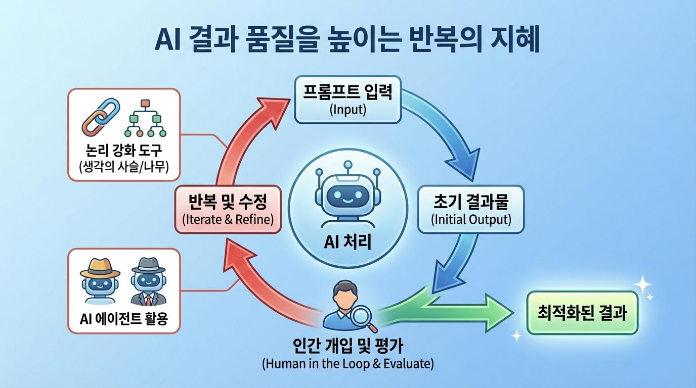 따라서 인공지능의 결과를 맹목적으로 신뢰하기보다는, 우리가 최종 검증자가 되어야 합니다. 결과물이 사실에 기반했는지, 혹은 특정 편향이 반영되지는 않았는지 꼼꼼히 확인하는 '인간 개입(Human in the Loop)'이 중요합니다. 만약 결과가 만족스럽지 않다면, 다음과 같은 전략으로 프롬프트를 수정할 수 있습니다.